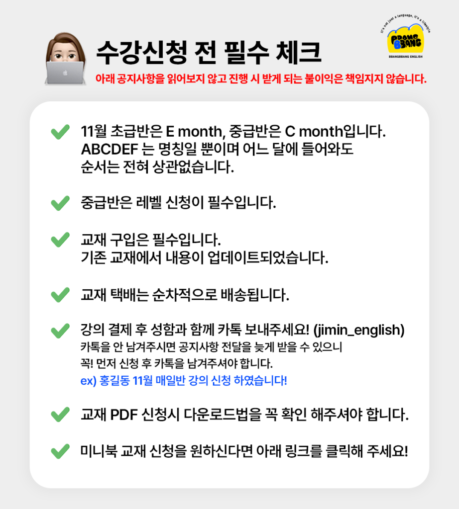 - 라이브 강의로 보고 싶으신 분들은 인스타그램 jimin_english 추가후 알림 설정을 해두시면 인스타 라이브로 종종 라이브 수업이 송출되오니 참고 부탁 드립니다.